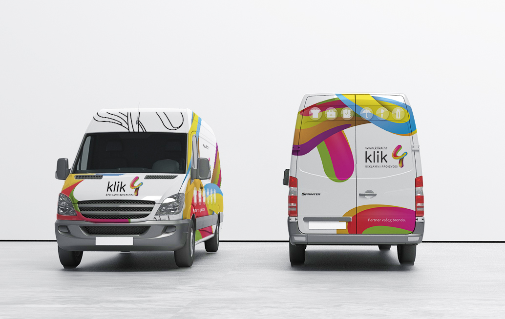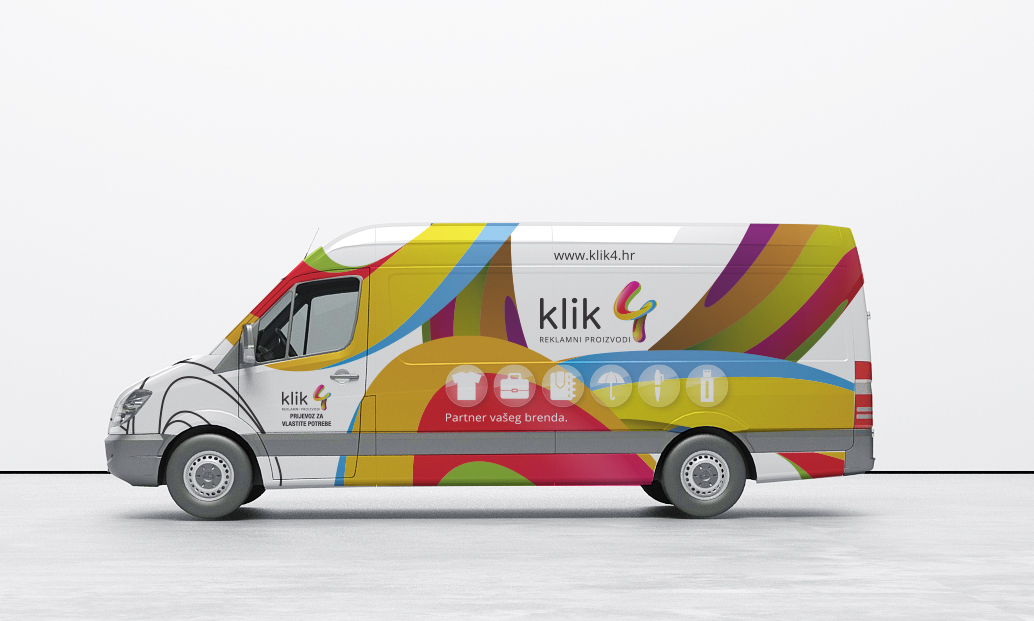 Tvrtka Klik4 iz Zagreba se bavi prodajom reklamnih proizvoda te tiskom ili vezom na njih. Pošto im je ponuda šarolika, sa tisućama artikala u svojoj ponudi, tako im i logo prati tu šarenu temu. Imali su potrebu ukrasiti svoja brojna vozila jedinstvenim dizajnom te su nas kontaktirali. Dizajn je pratio njihov već postojeći veseli logo, tako da nije bilo teško ukomponirati taj vizual na vozilo. Baš zbog toga što je logo toliko zanimljiv smo odlučili koristiti samo njega kao motiv cijelog dizajna vozila. Ovaj šaren i upečatljiv dizajn će sigurno biti zamijećen na cestama Zagreba i Hrvatske. Dobar dizajn daleko se čuje.